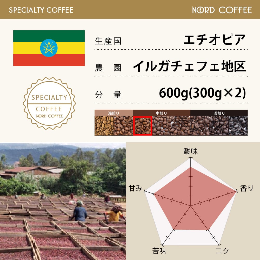 エチオピアはナチュラル精製が主流ですが、イルガチェフェは伝統的な水洗処理、天日乾燥により仕上げられています。